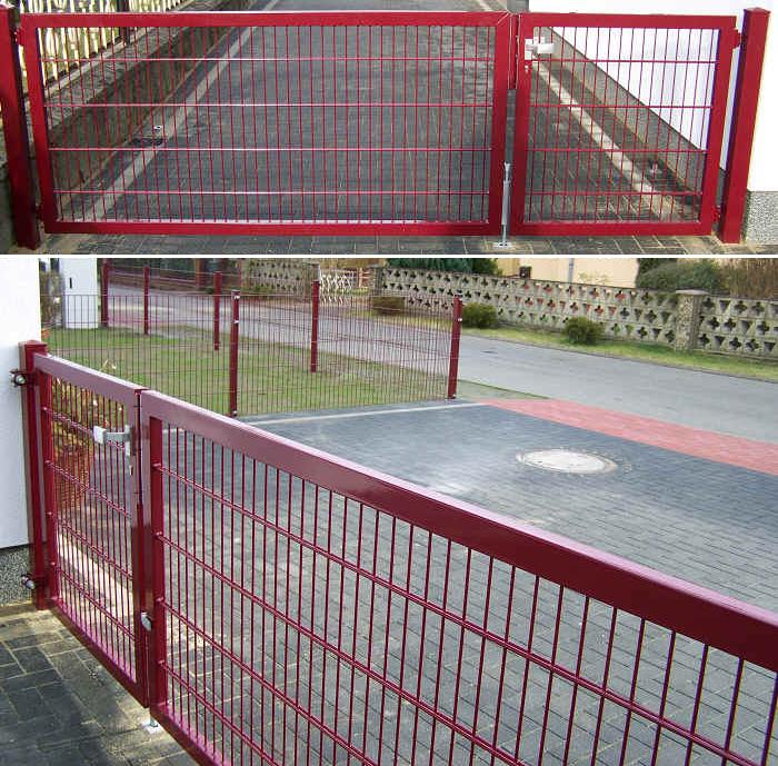 Doppelstabmatten Zaunsystem in Weinrot RAL 3005 - Höhe 1000 mm - Industrietor mit asymmetrischer Flügelteilung