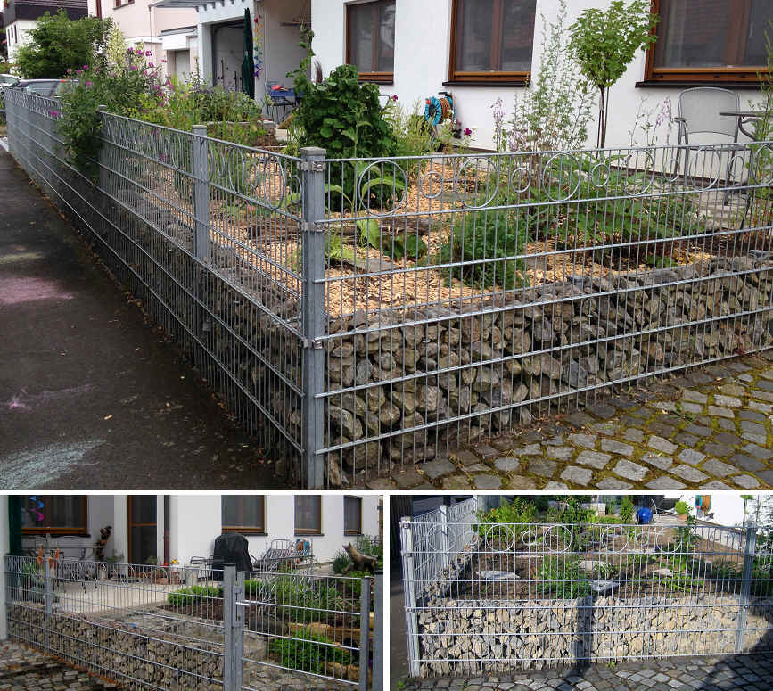 Gabionen Steinmauer Höhe 600 mm, mit integrierter Schmuckmatte DEKO Typ R11 und Basic Tor - Höhe 1200 mm